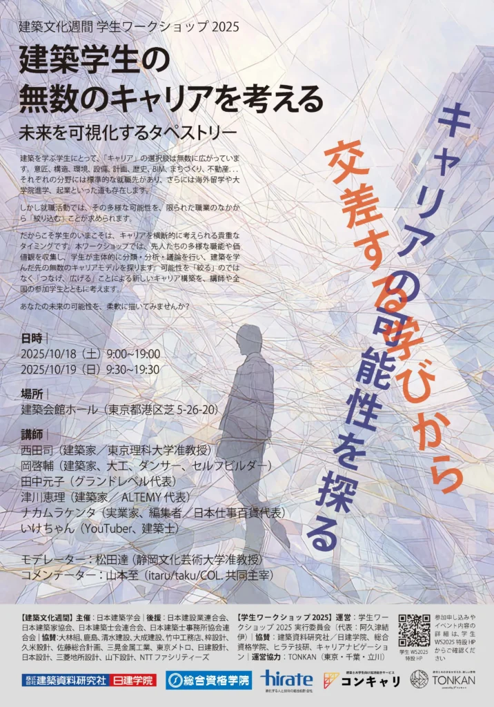 日本建築学会主催 建築文化週間 学生ワークショップ2025「建築学生の無数のキャリアを考える:未来を可視化するタペストリー」が開催されます。