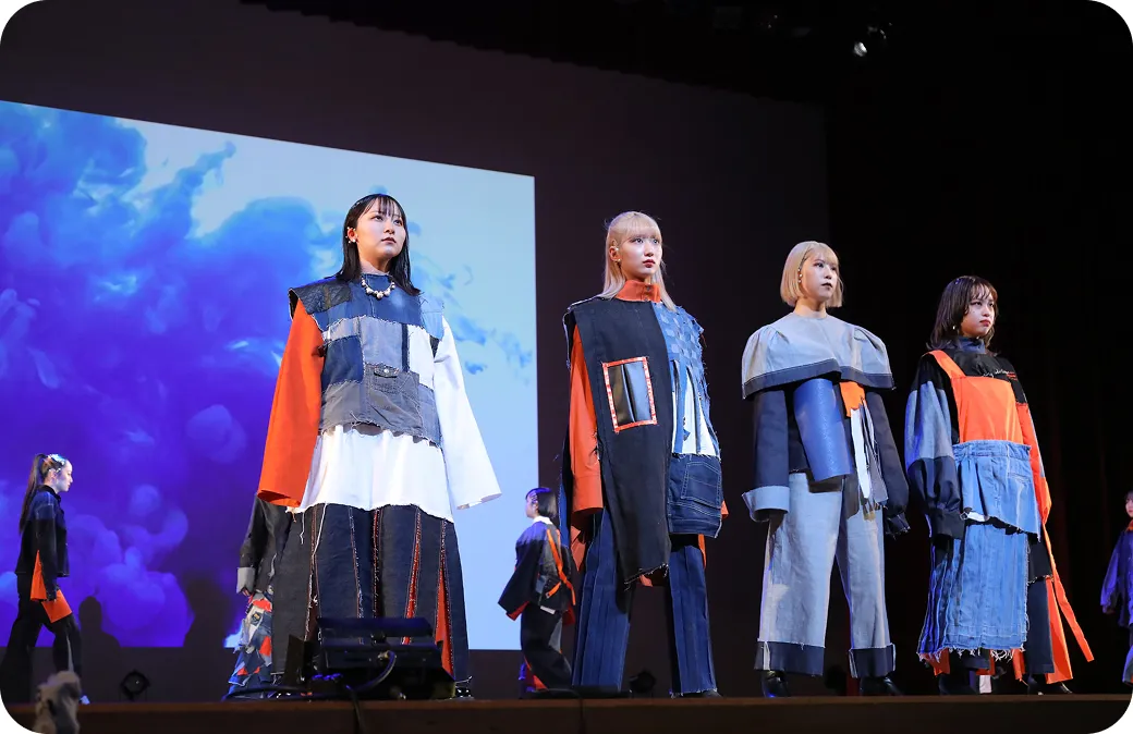 毎年、本学科の学生有志150名以上によるファッションショーを文化祭で披露しています。各領域の学生たちが、各々の特技などを活かして、衣装のデザインや制作だけでなく、映像や音源の編集、写真集の制作などに取り組んでいます。