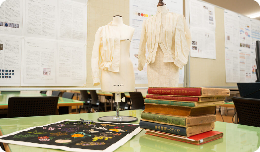 私はこの学校で実際に使用されていた教材資料をもとに、授業の様子や学びの中身を読み解こうとしています。当時、衣服はただ「着るもの」ではなく、「学ぶもの」「教えるもの」でもありました。そこに込められた思いや時代の変化を、残された資料から丁寧に探ることが、私の研究の中心です。